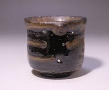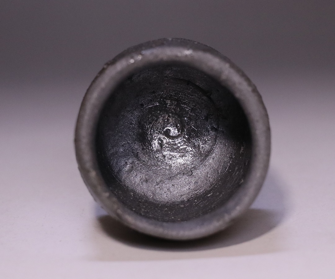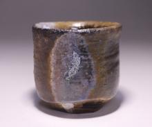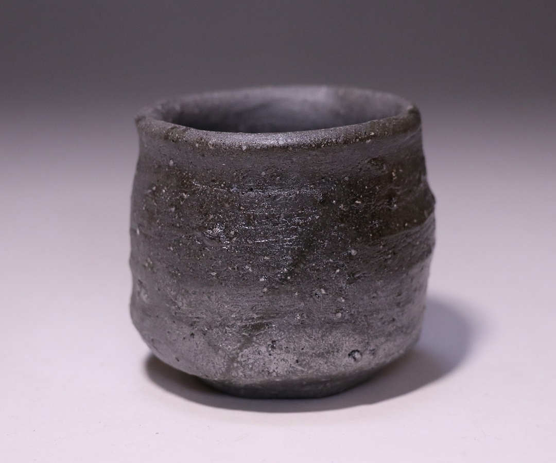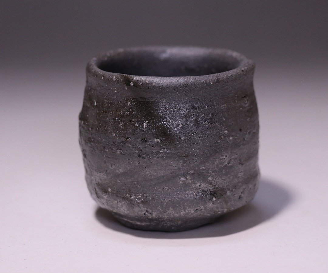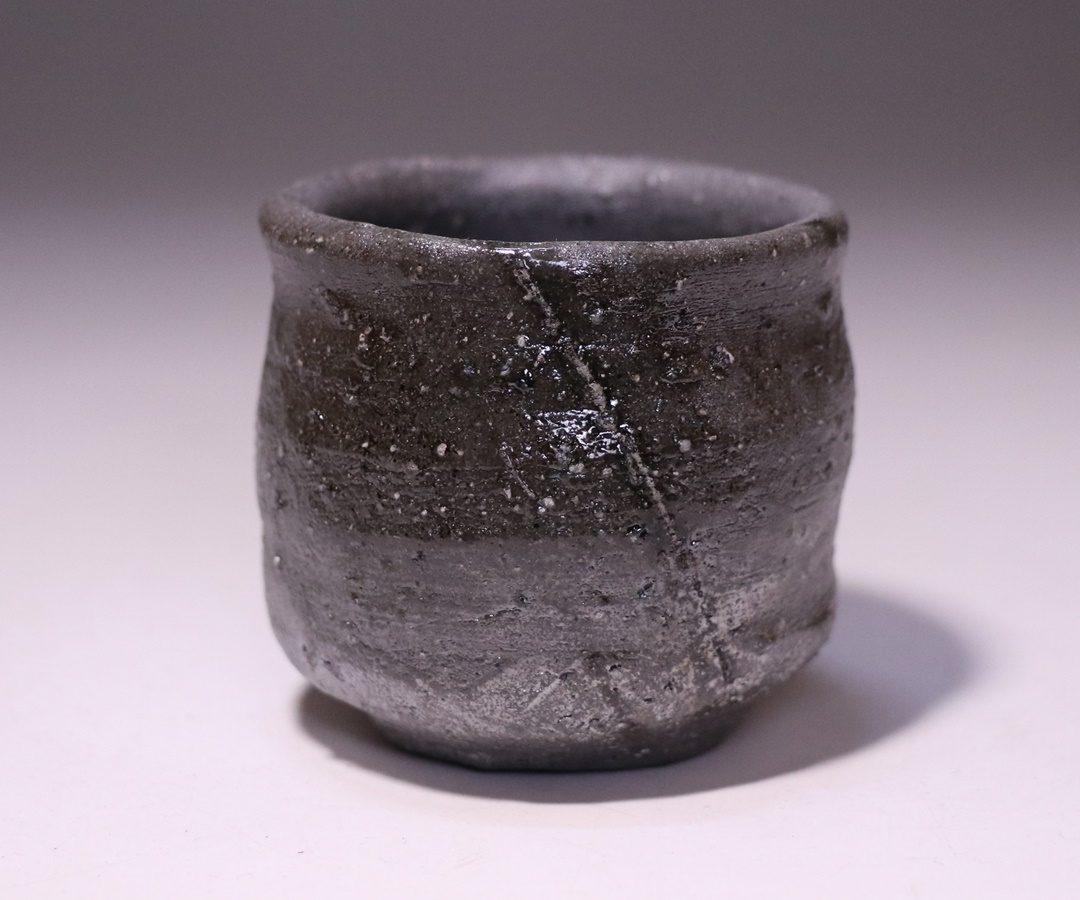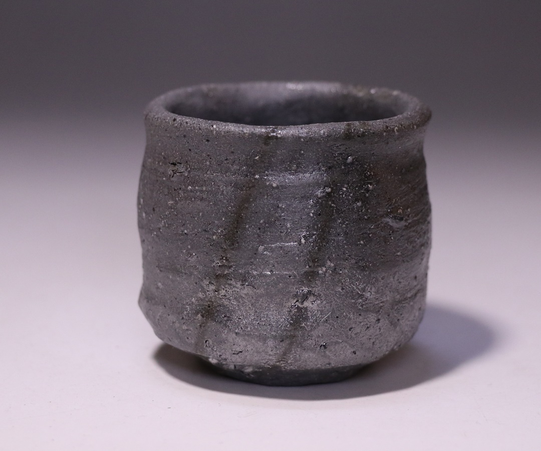 Distinct from the traditional expressions born solely of climbing-kiln firings, this piece employs the post-2000 Hikidashi technique: the cup is set near the stokehole of a noborigama, then pulled mid-firing and rapidly cooled to carbonize the surface.