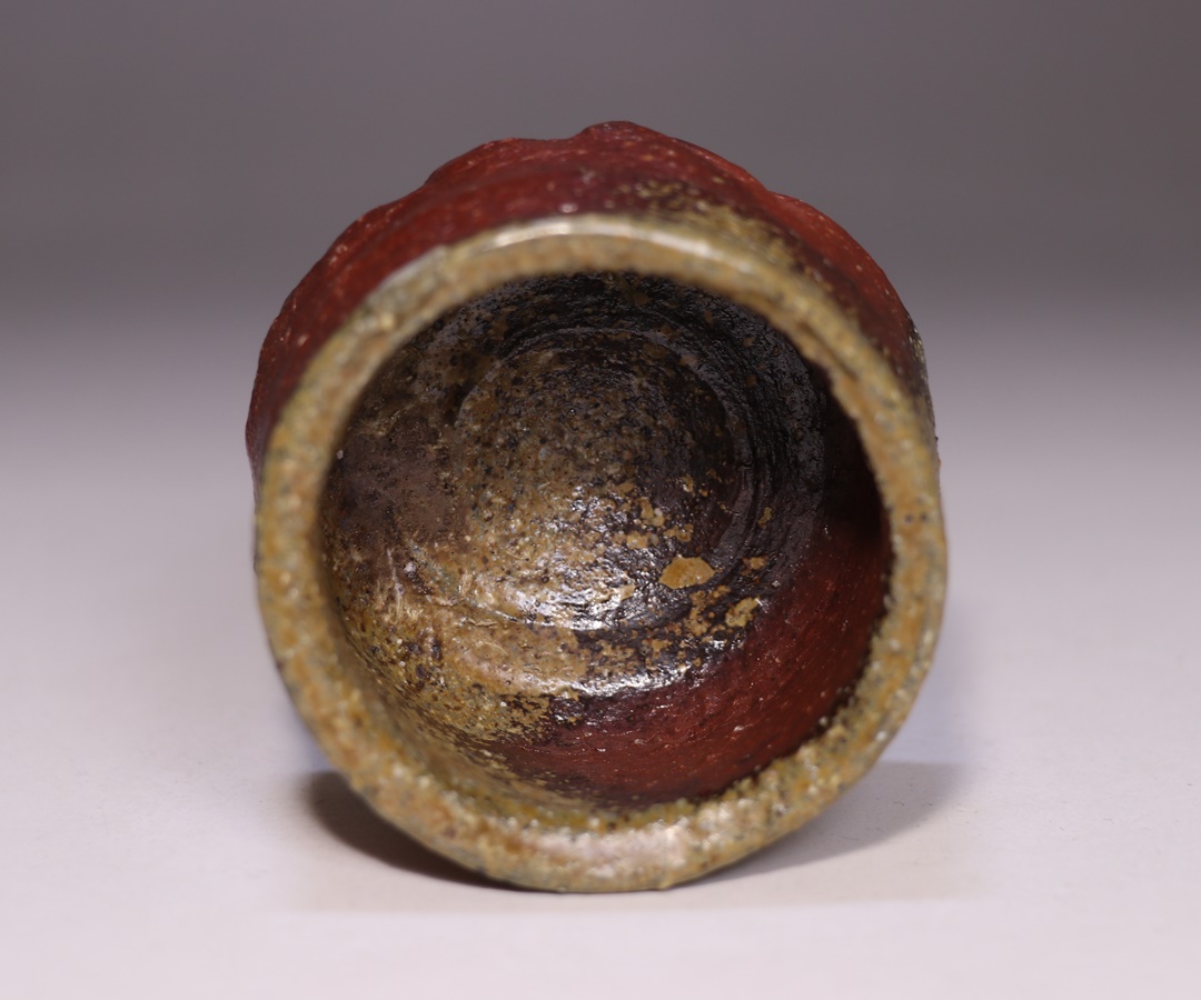 Its distinctive form, reminiscent of a tea bowl reduced in scale, together with its coloring, calls to mind a Raku tea bowl.