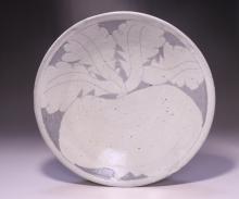 The turnip motif, rendered through the studio’s signature meticulous white slip and Kakiotoshi technique, is paired with a simple and classic ash glaze that enhances the colors of the food served upon it. The resulting glaze tone is a refreshing gray that perfectly complements a variety of ingredients.