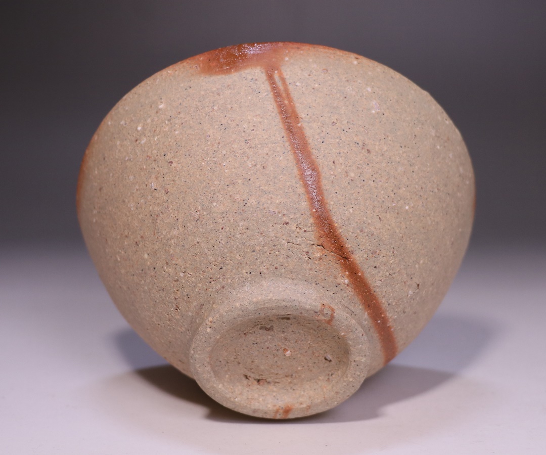 This bowl is formed with a higher proportion of mountain soil, yielding a matte surface studded with small stones—a character distinct from tatsuchi (paddy-field clay). The firing takes full advantage of mountain soil’s inherent toughness: on the outer surface, one side presents a gray ash-deposit transformation known as namako-hada (“sea-cucumber skin”), while the interior shows a brighter Hiiro (scarlet clay color) that captivates the eye. As a subtle hidden delight, a vivid Hiiro also resides at the center of the footless base, revealed after use.