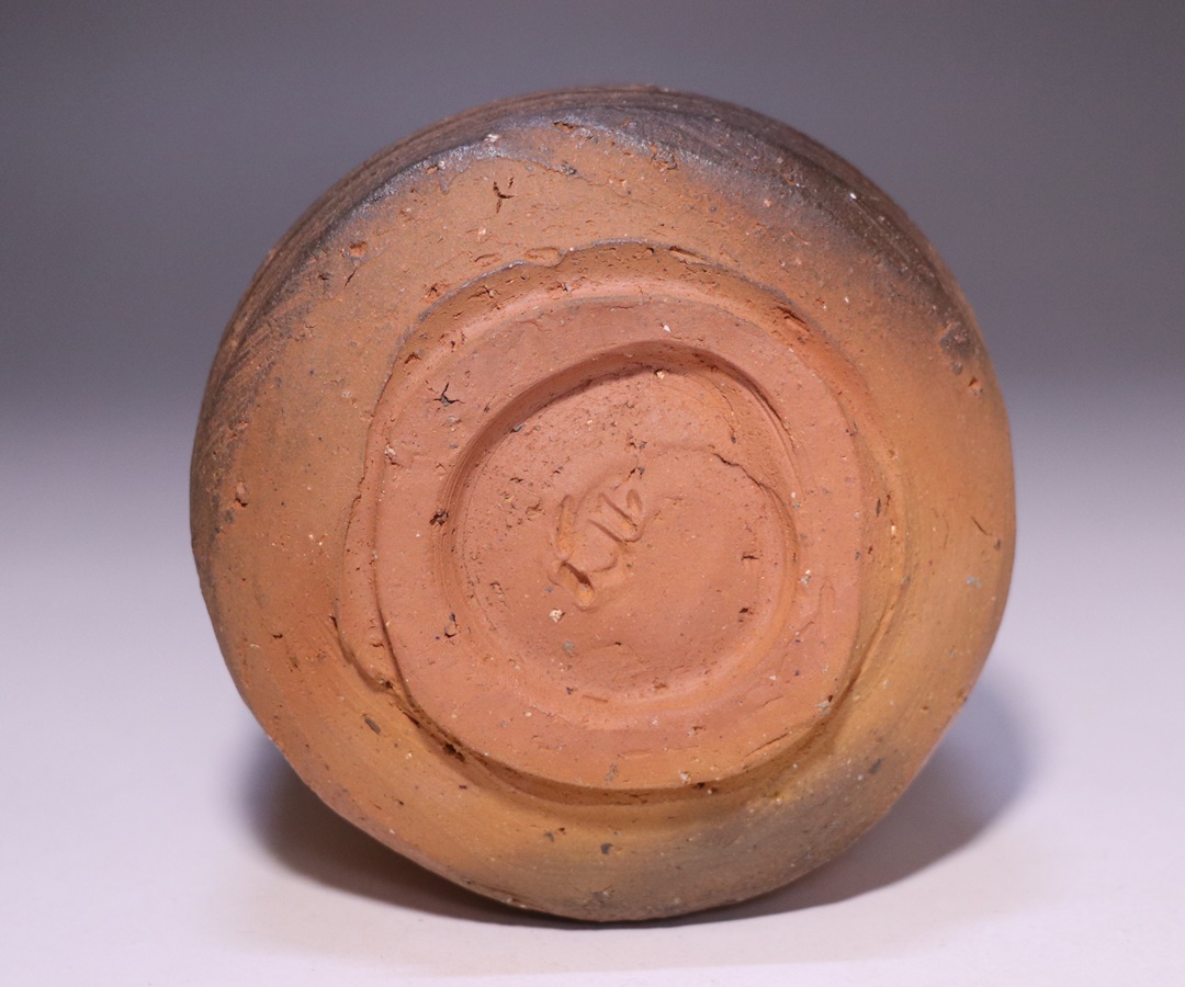 Inside the well, the firing advanced further than the front scarlet, yielding the dense shiso-purple tone that is quintessential to Bizen-yaki.