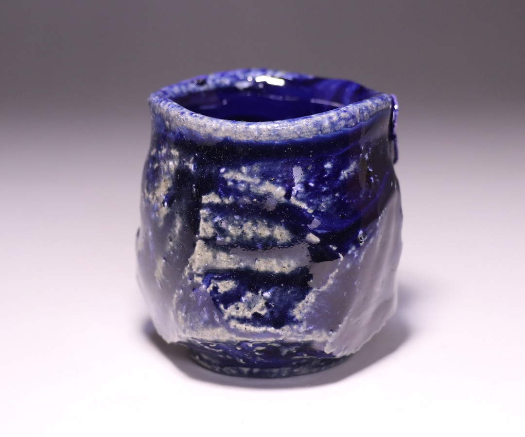 箆によるカットを多用した造形の故に、自然釉や藍色の濃淡が作品に生まれ、