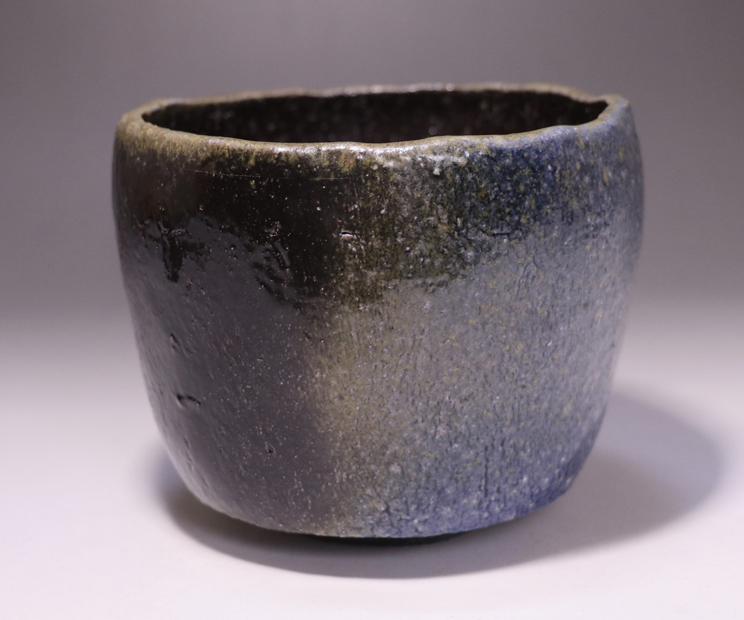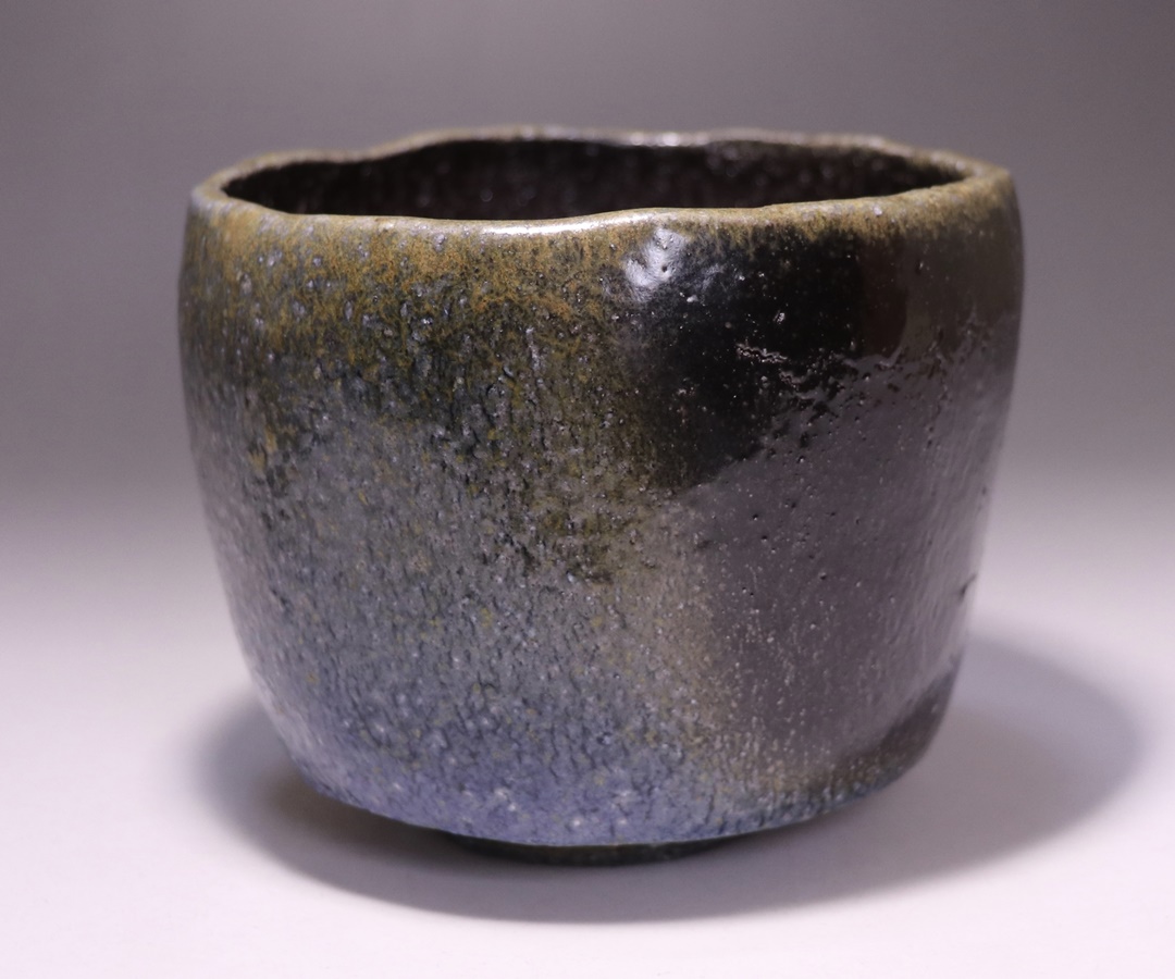黒作品の魅力の一つに、コバルトと自然釉が反応した通称「青窯変」がありますが、