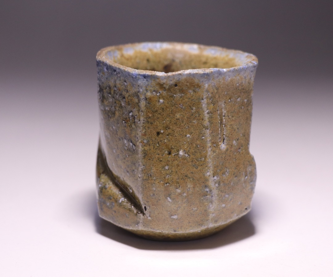 円筒形の作品を箆で丁寧に面取りをして八角に成形しており、