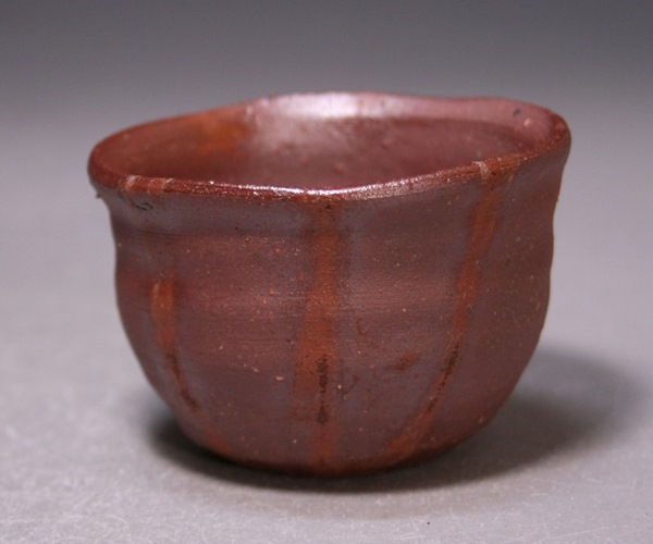 四人目の人間国宝である藤原 雄先生に師事し、師の作風を受け継ぎつつ独自の展開を試みる岡田 輝先生の備前酒杯です。多種多様な藤原家の緋襷の中でも緋色の土味に臙脂色の緋襷が出るタイプが選択されています。師の作風を受け継ぎシンプルを突き詰めたような作風となっており、けれん味のない轆轤捌きが特徴となっています。高台も作風に合わせてベタ切りの碁笥底にしており、シンプルな作風により磨きがかかっています。
