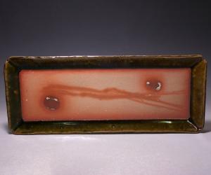 川端文男先生に師事し、現代の生活にマッチしたものづくりを目指す中原幸治先生の新作織緋長皿です。織部の施釉による汚れにくさや使いやすさ、備前土による味の変化や使用時の変化の両方を狙った織部緋襷の作品です。備前土の持つ変化する美しさや使い心地の良さを残したまま、外周部を織部釉で補強し食器としての完成度を高めています。中原先生らしい丁寧な作りが素晴らしく、重すぎず軽すぎず収納もしやすく非常に取り回しの良い皿となっています。欠けやすい角の部分は隅切り入角にしており、ここにも中原先生の細やかな気配りが感じられます。