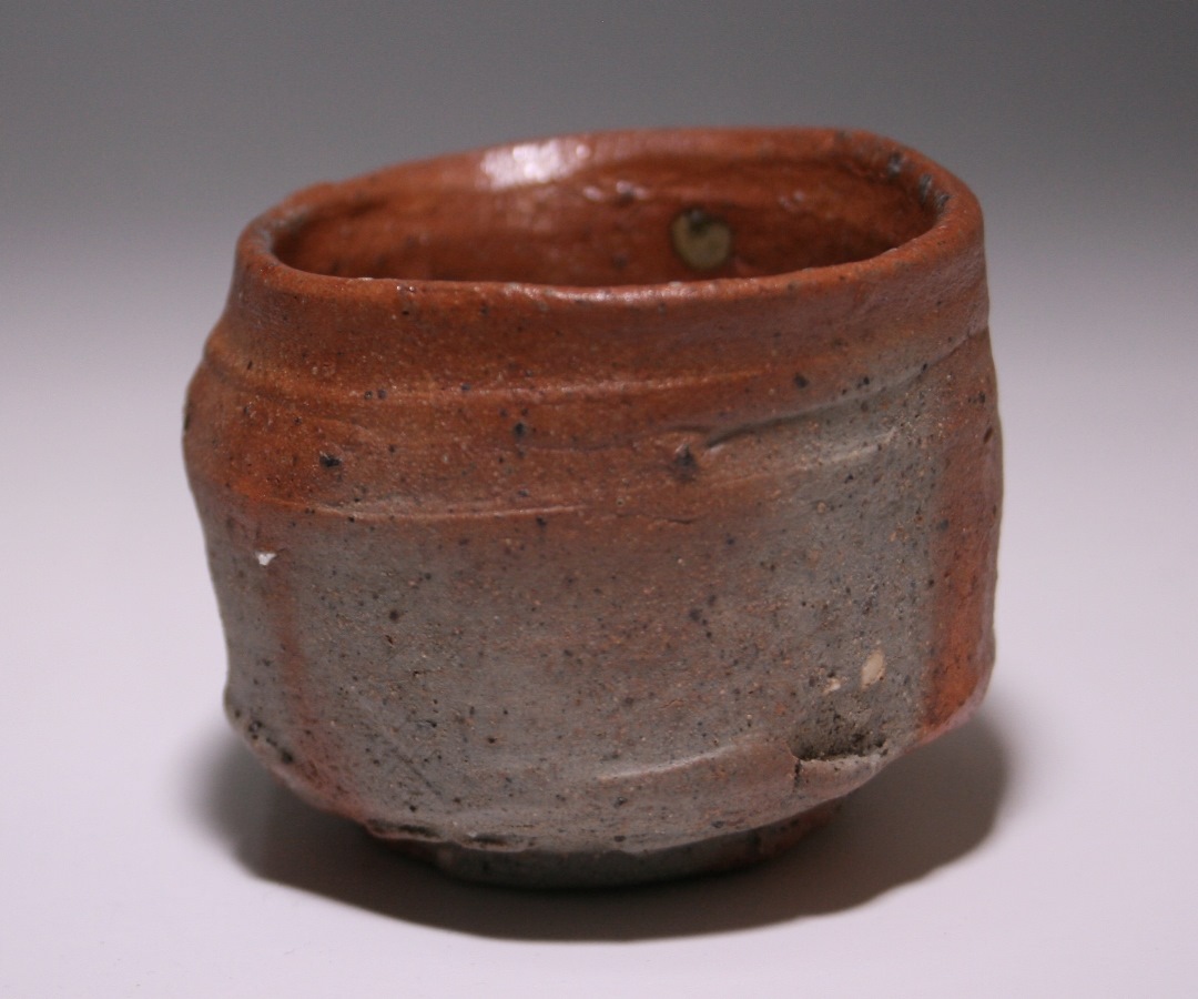 優れた美的感覚を持ち、土と焼きと造りに於いて常に進化し続ける森本良信先生の窯出しされたばかりの新作緋襷酒呑です。森本先生自身が「抜き物」と称する還元緋襷は、まさしくその名のとおりに土の中から濃厚な緋襷を抽出するように発色させています。青備前のような青灰色の土肌に、まるでまだ作品に火が宿っているかのような濃厚な朱色の襷が咲き乱れています。特別な削り込みや派手な意匠を施していないにも関わらず、作品の中に細かい動きが掛け合いが生まれており、古陶磁研究によるインプットと常に思考を絶やさない作品制作によるアウトプットで磨き上げられた森本先生の極上の造形力を堪能できます。森本先生曰く、還元緋襷は非常に奥深く、使い込めば使い込むほど土肌が味わいを増して楽しめるとのことです。