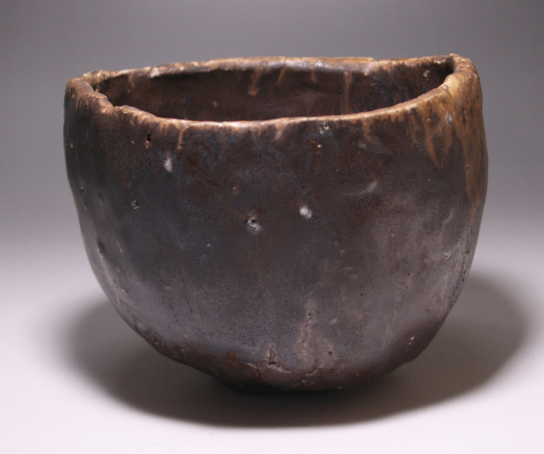 優れた美的感覚を持ち、土と焼きと造りに於いて常に進化し続ける森本良信先生の自然釉黒茶碗です。光悦風の遊び心溢れる造形に、限界まで自然釉を乗せて塗り土ではない自然な黒を発現させた意欲作です。森本先生が「被り物」と称する備前手の特徴である胡麻や桟切を纏っていく点を極め、高台まで全て自然釉で覆い尽くされており、人の手ではない熱風による釉掛けの妙味と、まるで全体をコーティングされたようなマットな自然釉の質感が何とも面白く感じます。備前の胡麻らしい黄色掛かった茶色の自然釉と、伊部手のような黒の自然釉とが混じり合い、塗り土では出せない立体的かつ複雑な景色を形成しています。茶碗の造形も火の加減の変形か作者の手によるものか判断を迷わせるところがあり、森本先生の古陶磁研究に基づいたミステリアスな面白さが見る者を虜にします。