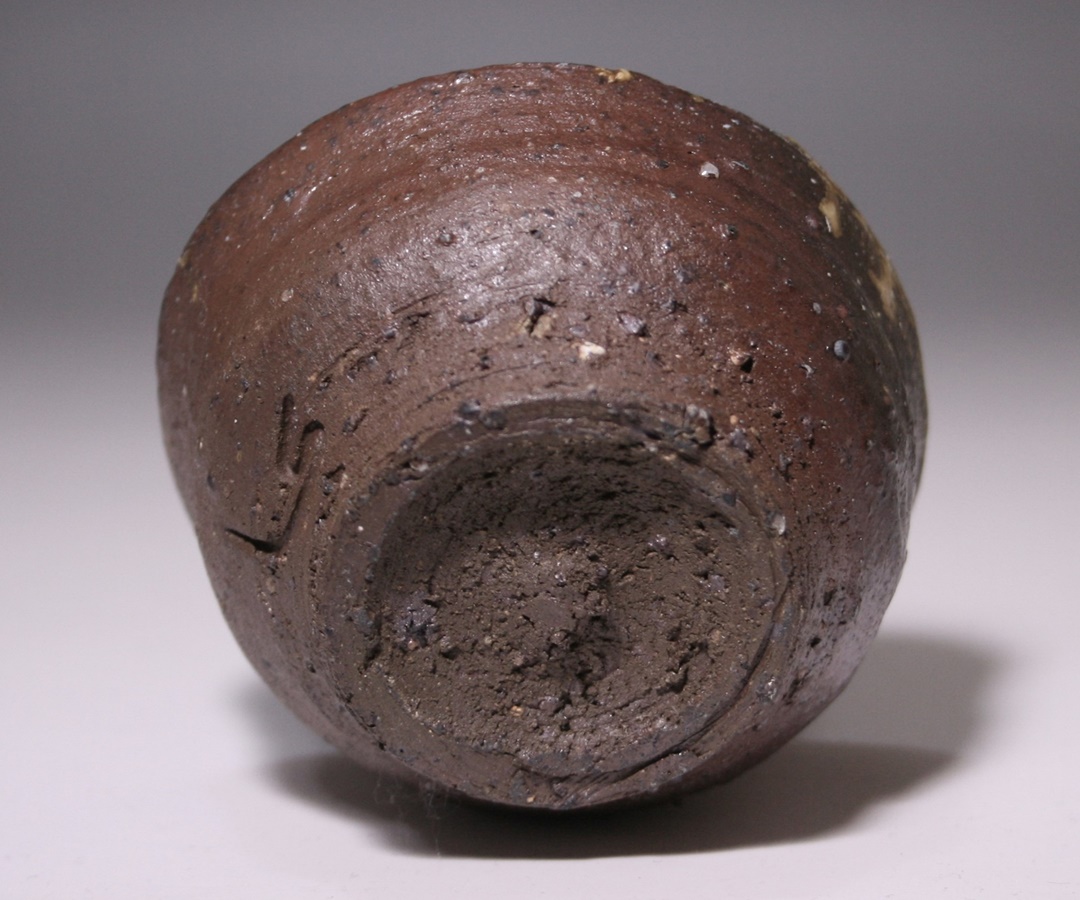 優れた美的感覚を持ち、土と焼きと造りに於いて常に進化し続ける森本良信先生の備前酒盃です。森本先生自身が「被り物」と表現する備前手の作品で、胡麻や桟切などが幾重にも重なり合い、重厚な窯変の着物を形成しています。しかし本作の肝はそこではなく、あくまでもその被り物を焼成する過程で生まれる絶妙な「抜け」であり、堅く焼きしまった肌の中に生まれる極上の陰影が見事です。現代備前でよく言われる甘焼きの抜けではなく、古備前の肌に確かに存在していた焼き締まった抜けを追求し、濃厚なチョコレートのような土肌に被り物と抜けを加えて立体的かつ濃密なテクスチャーを完成させました。そのような抜けと最も相性が良いであろう盃型の作品で、見込み部分にて森本先生が表現したい抜けを最もシンプルかつ分かりやすく再現されています。そして外周部では古備前と同様に藁を被せて焼く事で、藁の成分と自然釉が結びついて白胡麻や糸胡麻になっており、華やかさと枯淡な味わいが同居した見事な景色を作り上げています。