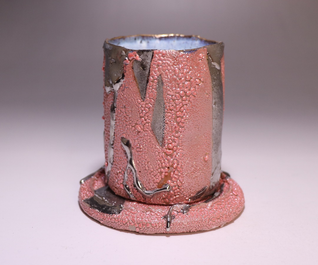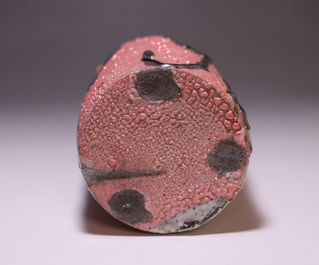 ピンクの面は仕上げにラスター彩のような虹色の仕上げ釉薬を重ね、