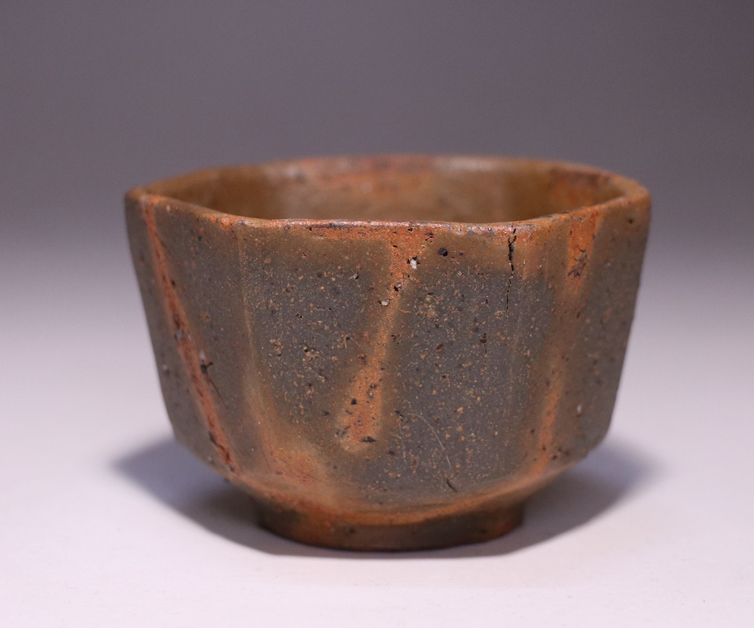 優れた美的感覚を持ち、土と焼きと造りに於いて常に進化し続ける森本良信先生のやや前作の備前緋襷六角盃です。